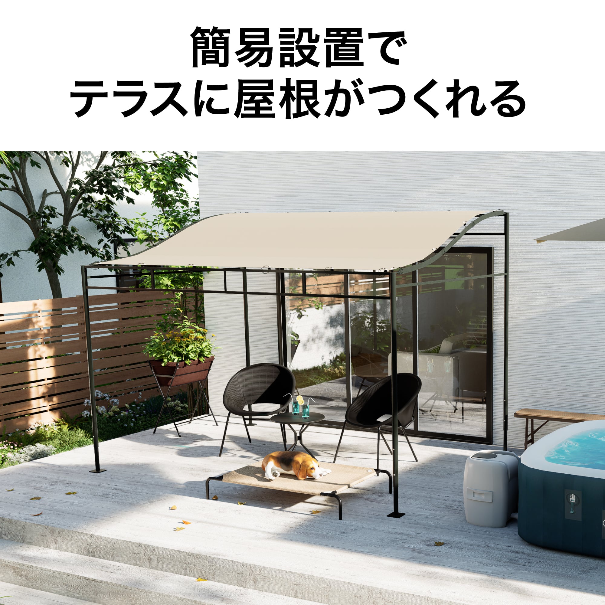| 備考 : | ●間口:正面/約幅305.8×高さ163.8cm・側面/約幅215.8×高さ163.8cm・背面/約幅305.8×高さ210.8cm ●UVカット率:約89.9% ●遮光率:約87.9% ●組み立て時間の目安:約40〜60分 ※取扱説明書に記載されている必要人員(3人)で組み立てた場合を想定した時間の目安です。 ●付属工具:スパナ、六角レンチ ●お客様手配必要工具:脚立 ※安全上2階以上には設置しないで下さい。 |