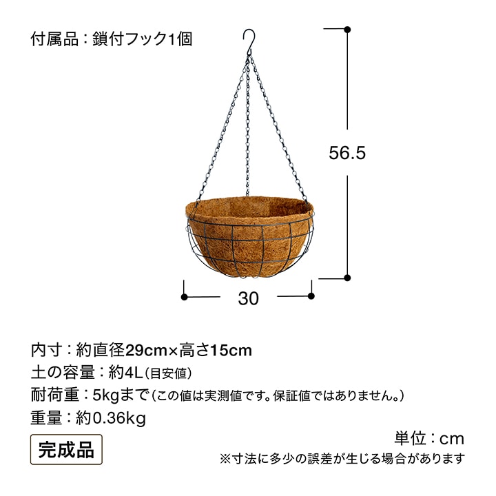 備考 : [土の容量]約4L(目安値)[耐荷重]5kgまで(この値は実測値です。保証値ではありません。)[付属品]鎖付フック1個