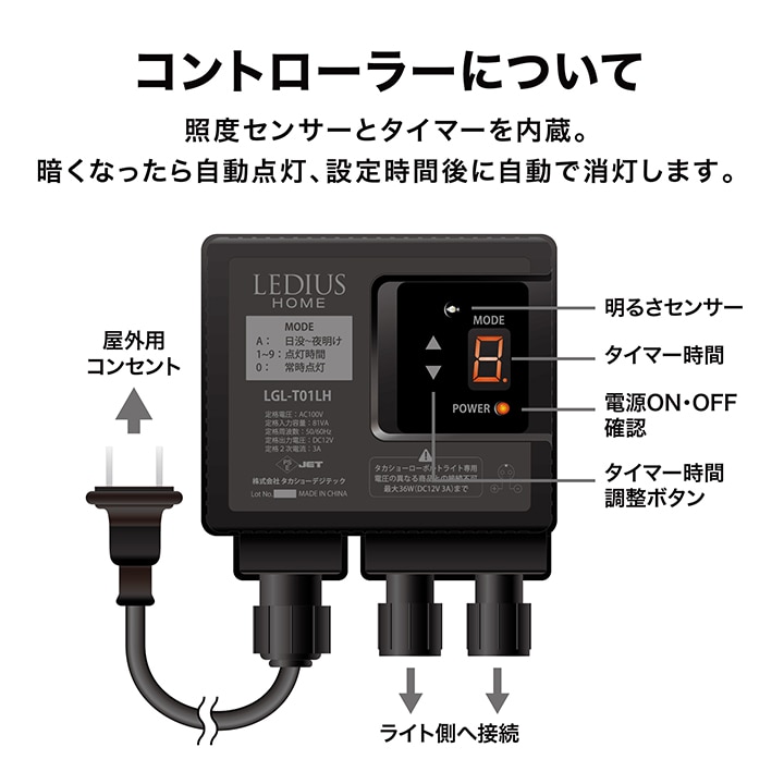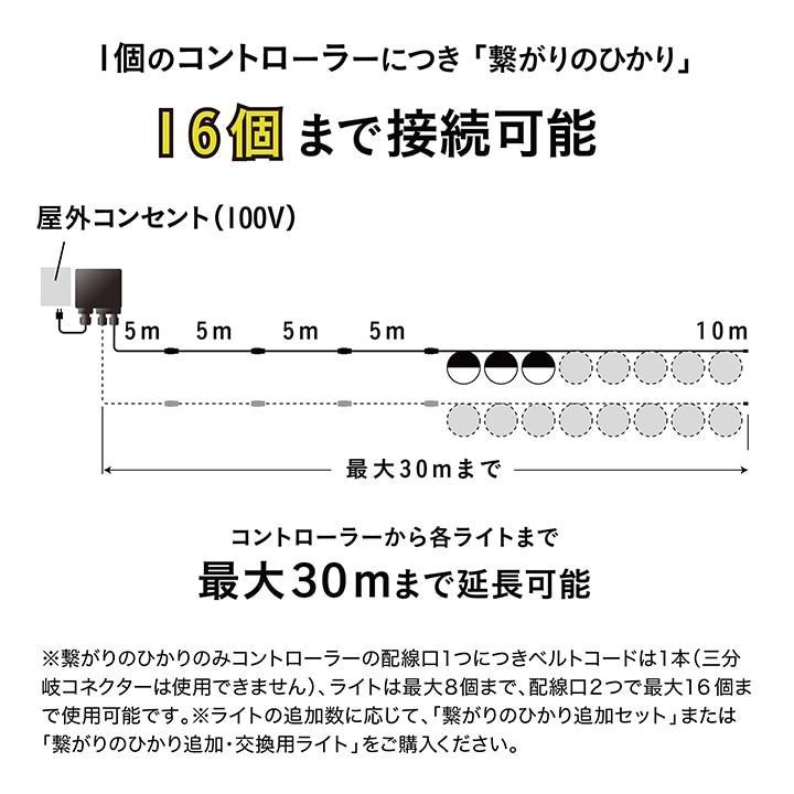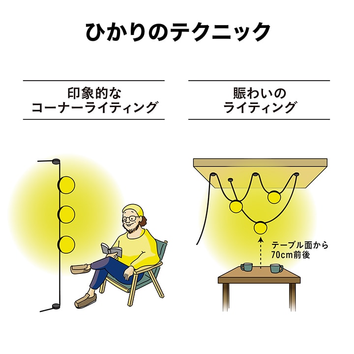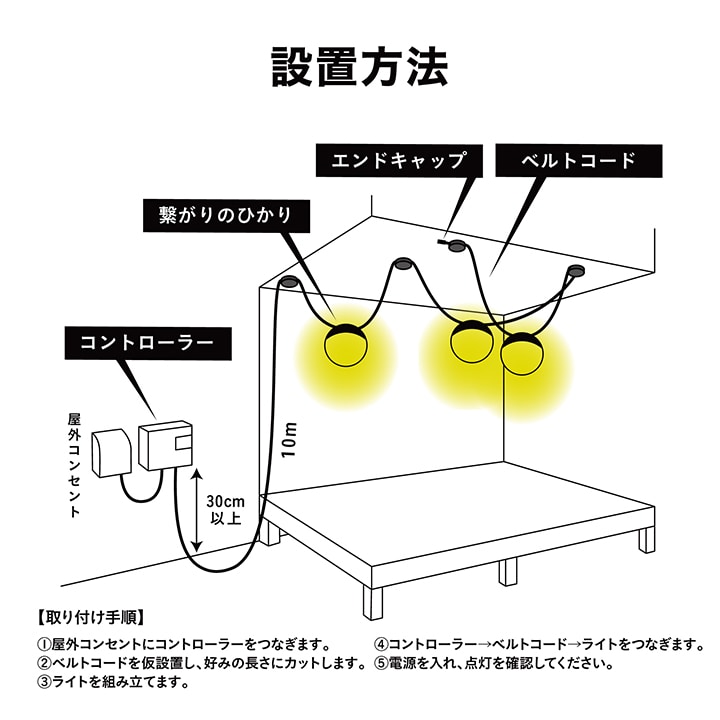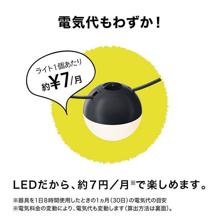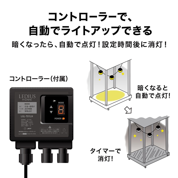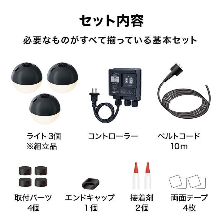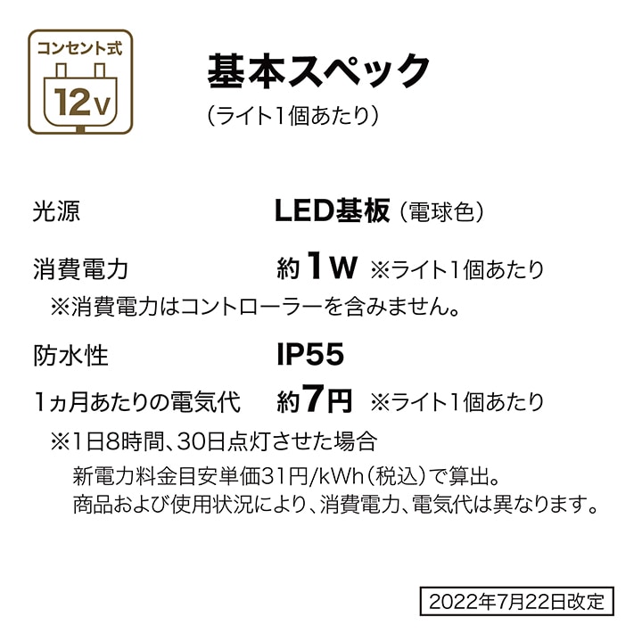 | 備考 : | [使用環境]屋外[コード全長]約10m [LED色]電球色(2700K)[LED数]1球/1台あたり [電圧]12V[消費電力]約1W/1台あたり ひかりノベーションシリーズの専用コントローラーへの接続可能 [防水性]IP55[ひかりノベーション専用コントローラー付属 [組立必要人数]1人[本体組立時間]20分未満 1年保証 |